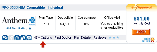 Because the type and amount of the fees differs between HSA Administrators, you should evaluate your options before setting up your account. Our site makes it easy to do this by presenting you with a link which allows you to view all your HSA Administrator options for each health insurance plan you are considering. Simply click the "HSA Options" link (illustrated below).