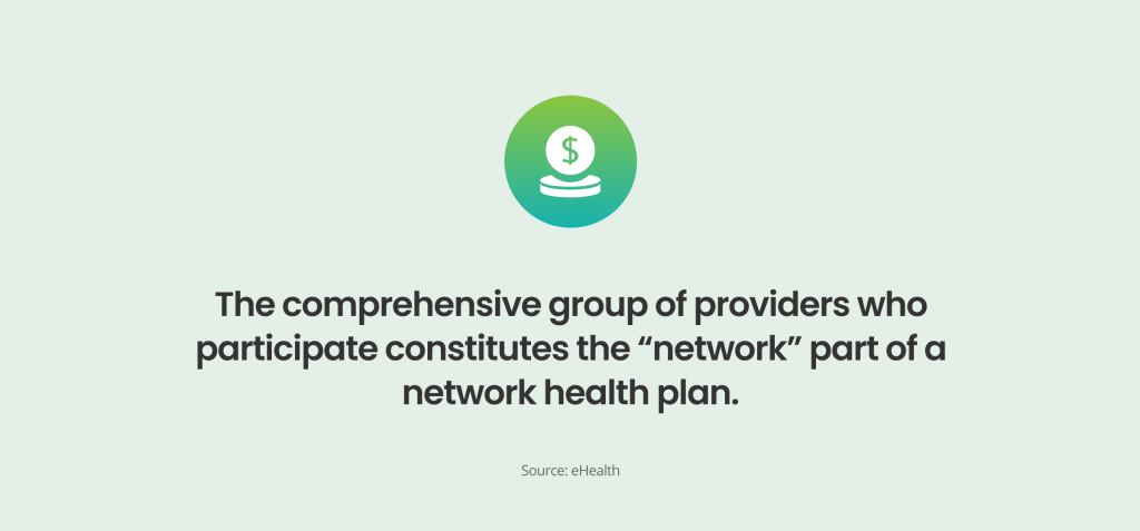 The definition of a network plan varies slightly by state, but they’re defined by the network. “Network” comes from the large group of physicians, hospitals, and other health care providers that have agreed to provide medical services to a health insurance plan’s members at a contracted rate. Often, the contracted rate is discounted from what providers charge patients who aren’t members of a contracted health insurance network plan.